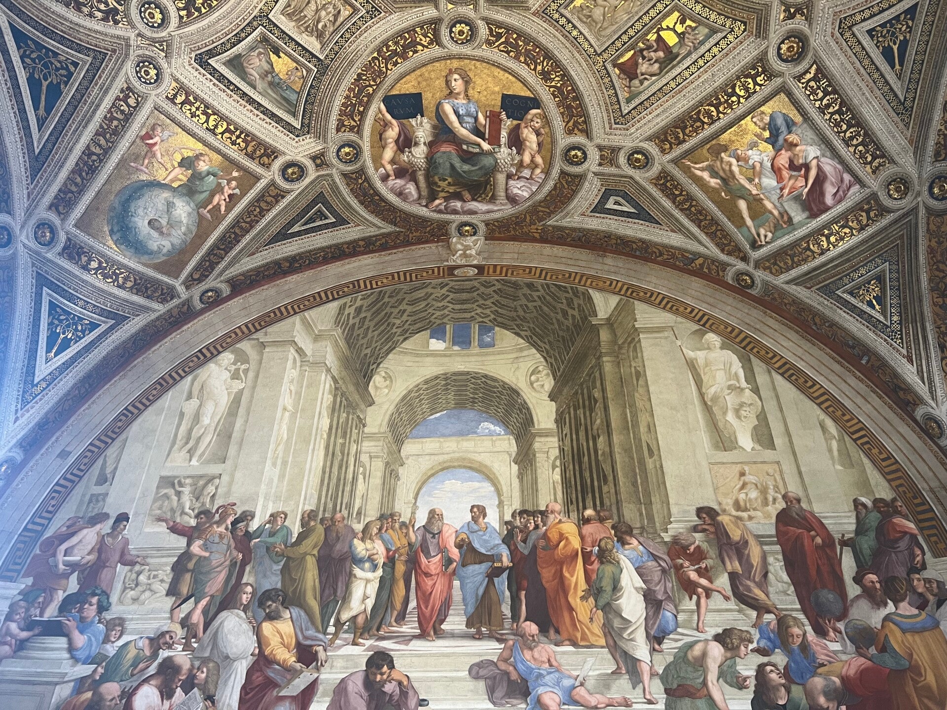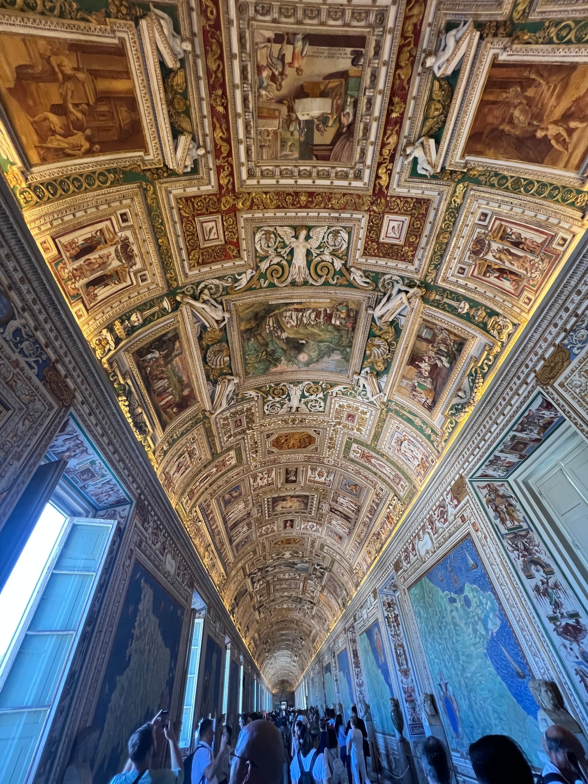 Morgens bin ich wieder laufen gegangen, musste mich diesmal für meine Kilometer aber mehr beeilen, damit wir rechtzeitig in die Vatikanstadt aufbrechen konnten. Mittwochs hält der Papst normalerweise um 11 Uhr eine Rede auf dem Platz vor dem Petersdom, die wir gerne hören wollten. Leider haben wir die um ein paar Minuten verpasst, konnten dafür aber den Petersdom bewundern. Daraufhin haben wir uns in die Schlagen vor den Vatikanischen Museen gestellt. Wie lange haben wir dort gestanden? 2 Stunden. Und haben sich das Warten und die Fußschmerzen gelohnt? Absolut und 100%. In den Vatikanischen Museen sind Meisterwerke von einigen der größten Künstlern der Welt ausgestellt, z. B. von Raphael oder Michelangelo. Besonders ist, natürlich, die Sixtinische Kapelle. Im späten Nachmittag war ich fertig mit meinem Rundgang. Die meisten Schüler unserer Reise sind an diesem Punkt ins Hotel gegangen. Aber ein paar von uns sind geblieben: Wir wollten unbedingt in und auf den Petersdom! Gesagt, getan. Die Schlange dafür war auch sehr viel schneller geschafft, als die vor den Vatikanischen Museen. Von außen ist der Petersdom schon beeindruckend, aber von innen erst recht. Unglaublich, wie schön die Decke des Petersdoms ist und wie groß der Dom von innen ist. Dann sind wir mit dem Fahrstuhl auf eine erste Ebene gefahren und dann weiter über 394 Stufen auf die Kuppel gestiegen. Es war mittlerweile gegen 17:30 Uhr abends, sodass das Licht über Rom in Richtung Sonnenuntergang tendierte. Wir sind alle noch einige Zeit geblieben und haben den Blick bestaunt.